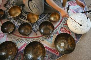 お香の香りが漂う北京のリラクセーション店で使われる楽器=2025年12月(共同)