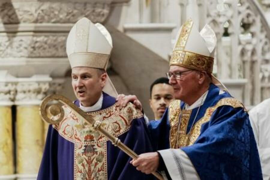 米ニューヨークでミサに参加するヒックス司教(左)とドラン大司教=2025年12月18日(ロイター=共同)
