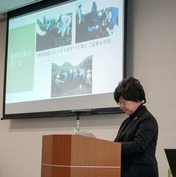 太平洋戦争の激戦地となった硫黄島での遺骨収集について語る戦争遺児の吉沢登志江さん=11日午後、東京都千代田区