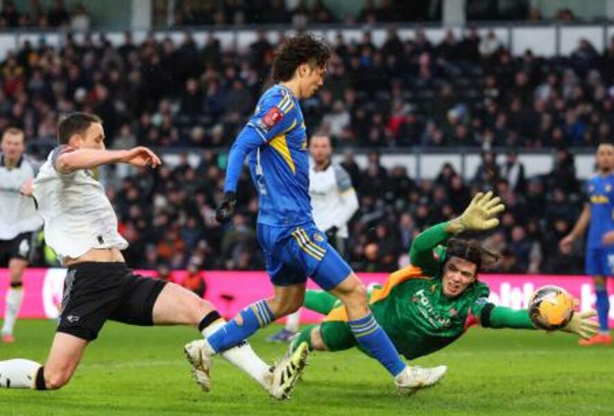 ダービー戦の後半、勝ち越しゴールを決めるリーズの田中(中央)=ダービー(ゲッティ=共同)