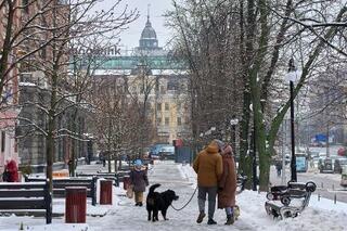 8日、ウクライナ首都キーウの雪が積もった通り(AP=共同)
