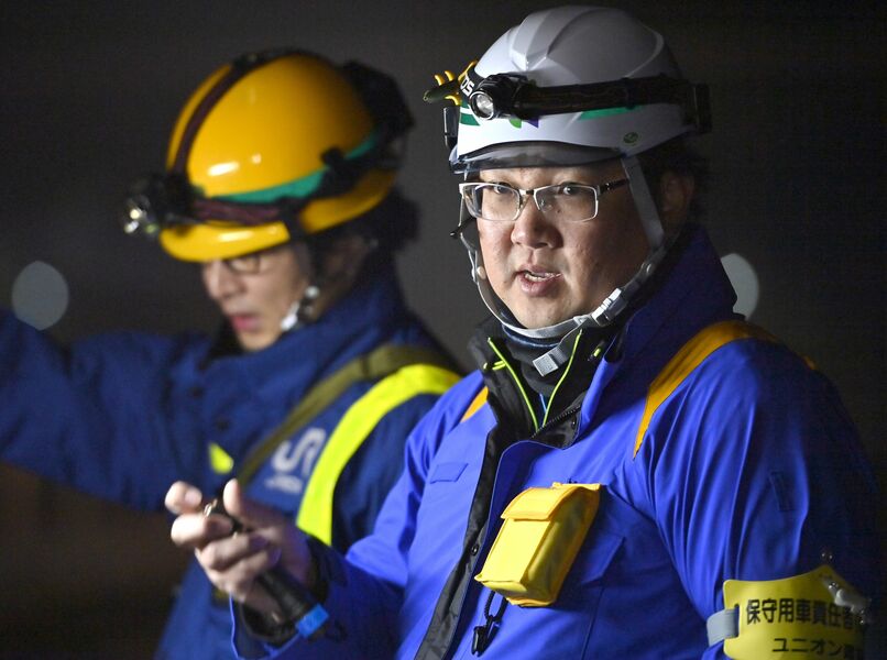 線路のゆがみが直っているかを確認する斎藤さん=2025年11月26日午前3時5分