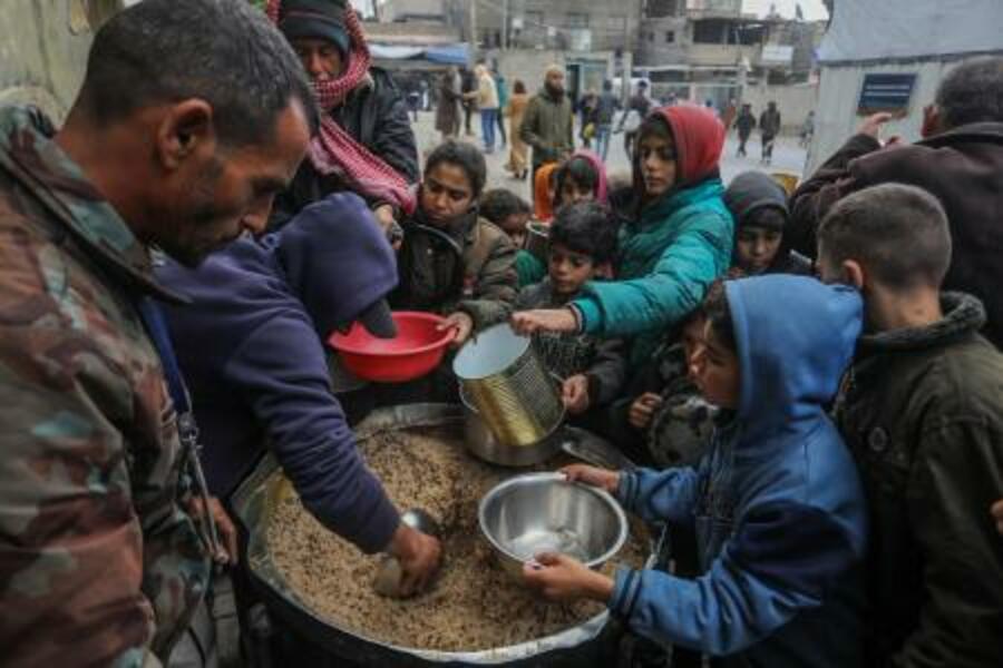 配給の食糧に殺到するガザの子どもら=11日(ゲッティ=共同)