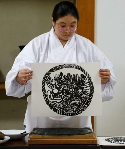 節分を前に熊野那智大社でピークを迎えている「鬼面札」作り=14日午後、和歌山県那智勝浦町