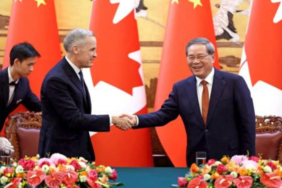 カナダのカーニー首相(左)と握手する中国の李強首相=15日、北京(ロイター=共同)