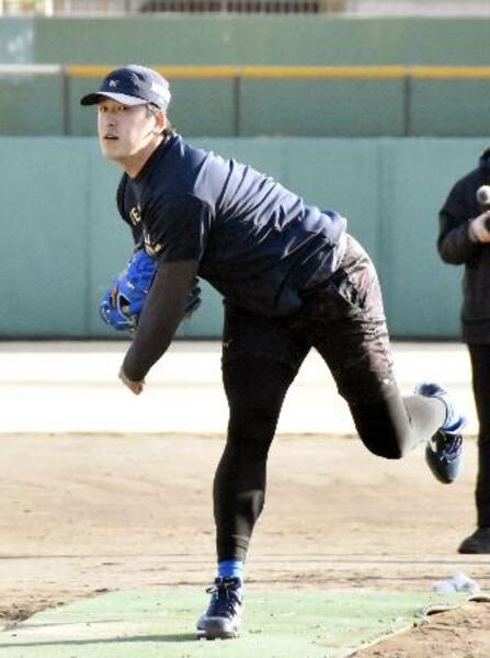 投球練習する西武の隅田=福岡県久留米市