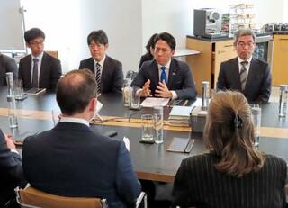 パランティア・テクノロジーズ社幹部と意見交換する小泉防衛相(奥右から2人目)=16日、米ワシントン(共同)
