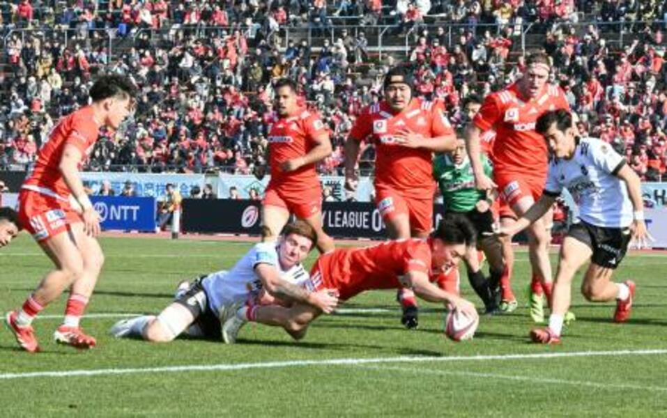 神戸―BR東京 後半、トライを決める神戸の李承信。試合前には阪神大震災の犠牲者を悼み黙とうがささげられた=神戸ユニバー