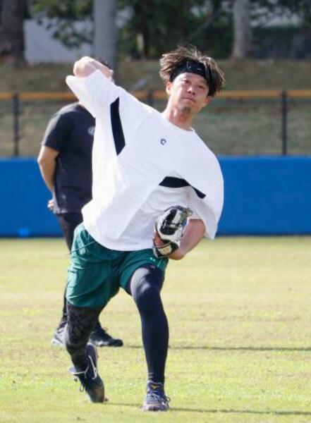 キャッチボールをするオリックス・岩崎=沖縄県読谷村