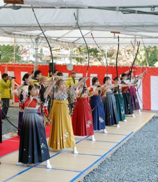 京都市東山区の三十三間堂で開かれた、20歳の男女が弓の腕前を競う大的全国大会=18日午前