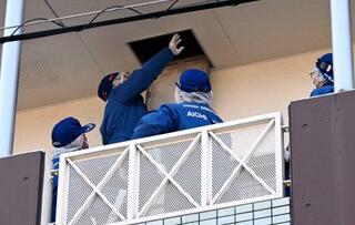 室内で焼けた女性の遺体が見つかった集合住宅を調べる捜査員=18日午前、愛知県豊田市東新町