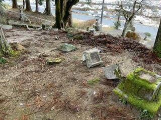 「布部断層」東部に位置する神社の倒壊した灯籠=7日、島根県安来市(広島大の熊原康博教授提供)