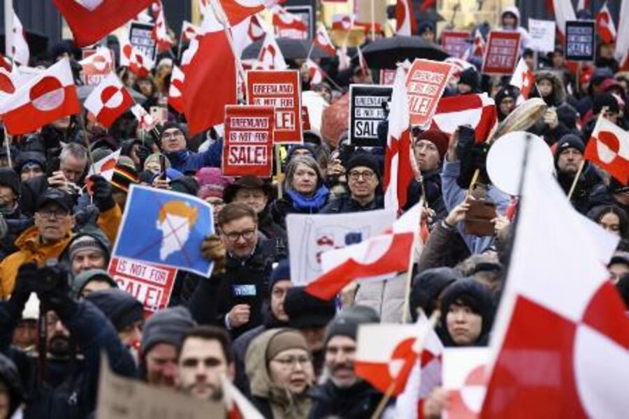 グリーンランド中心都市ヌークで行われた、領有を目指すトランプ米政権に抗議するデモ=17日(ゲッティ=共同)