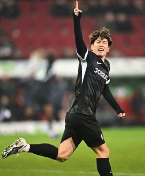 アウクスブルク戦の後半、ゴールを決め喜ぶフライブルクの鈴木唯=アウクスブルク(共同)