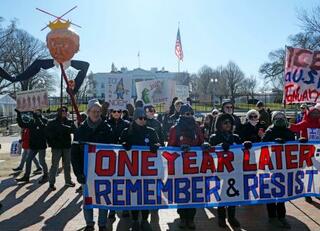 米ホワイトハウス近くで実施された、トランプ政権に抗議するデモ=20日、ワシントン(共同)
