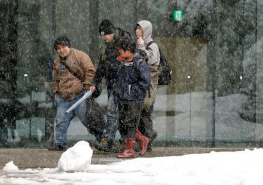 雪が降る新潟県長岡市内を歩く人たち=20日午後