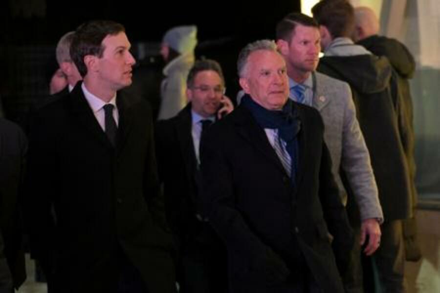 米国のウィットコフ和平交渉担当特使(手前右)とクシュナー氏(同左)=20日、スイス・ダボス(ロイター=共同)