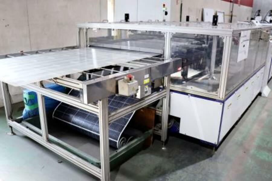 リサイクルのため、ガラス板(上)と表面部分のシートに分けられた太陽光パネル=19日、東京都大田区
