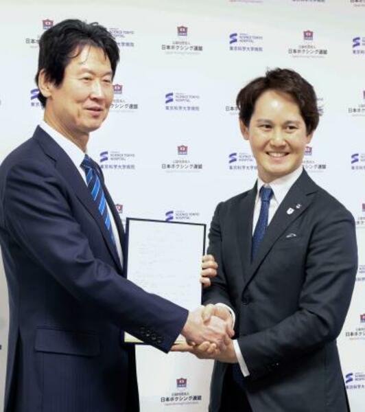 医療連携などに関する覚書を締結した東京科学大病院の藤井靖久病院長(左)と日本ボクシング連盟の仲間達也会長=21日、東京都新宿区