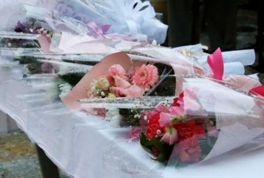 受験生の死亡事故から1年となり、現場付近の献花台に手向けられた花束=22日午前、福島県郡山市