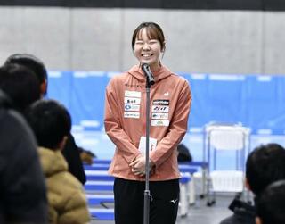 交流会で子どもたちの質問に笑顔で答える吉田雪乃=青森県八戸市