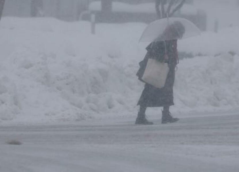 新潟県長岡市で雪が降る中を歩く人=22日午後