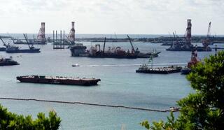 米軍普天間飛行場の移設に向けた工事が進む、沖縄県名護市辺野古沖の大浦湾=24日午前