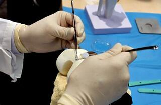 培養軟骨を膝の関節に移植する手術を再現した様子=22日、東京都中央区