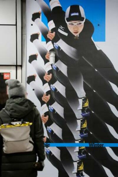 地下鉄駅構内に施された冬季五輪関連の装飾。スピードスケート女子の小平奈緒さんの滑走写真も見られた=23日、ミラノ(共同)