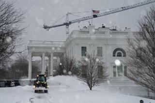 ホワイトハウスの上に架かる工事のクレーン=25日、ワシントン(AP=共同)