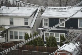 テネシー州の住宅街で電線にぶら下がったつらら=25日、ナッシュビル(AP=共同)