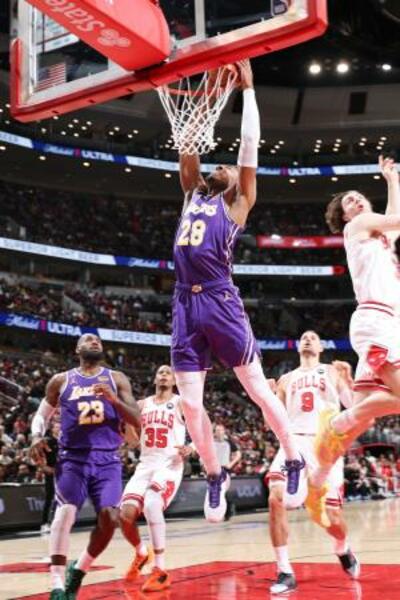 ブルズ戦でダンクシュートを決めるレーカーズの八村=シカゴ(NBAE・ゲッティ=共同)