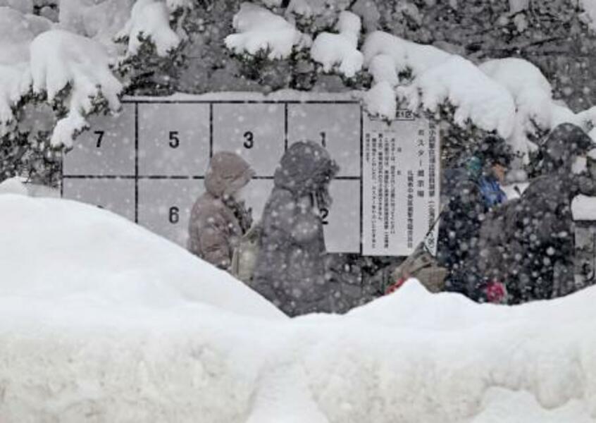 雪でかすむ衆院選候補者のポスター掲示板=26日、札幌市