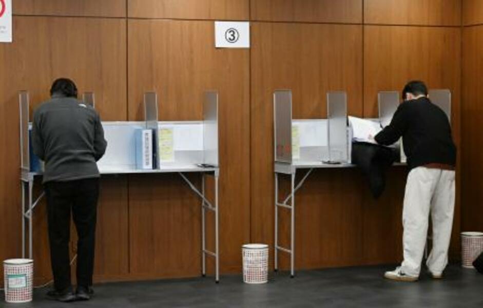 衆院選の在外投票が始まり、韓国・ソウルの日本大使館で在外投票する有権者=28日(共同)