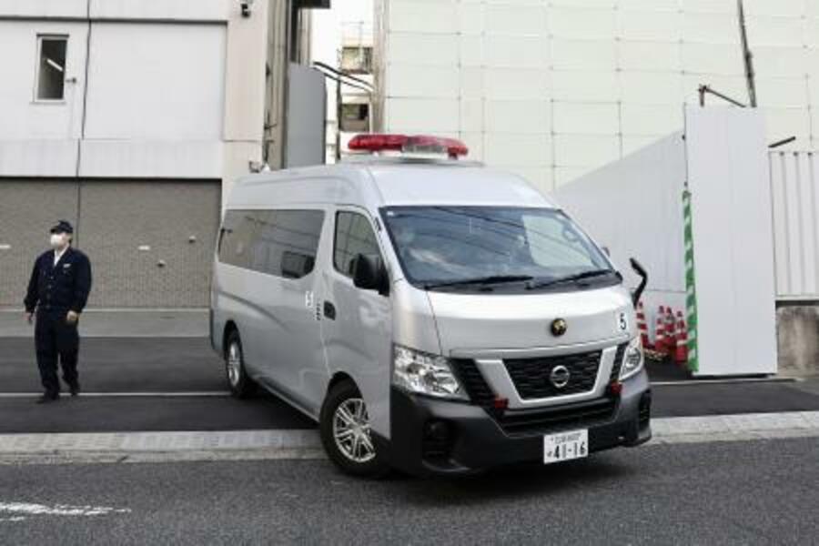 送検のため、留置施設を出るプロ野球広島の選手羽月隆太郎容疑者を乗せた車=29日午前9時22分、広島市中区
