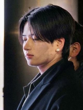 勤務するホストクラブから連行される竹岡拓人容疑者=28日、東京都新宿区