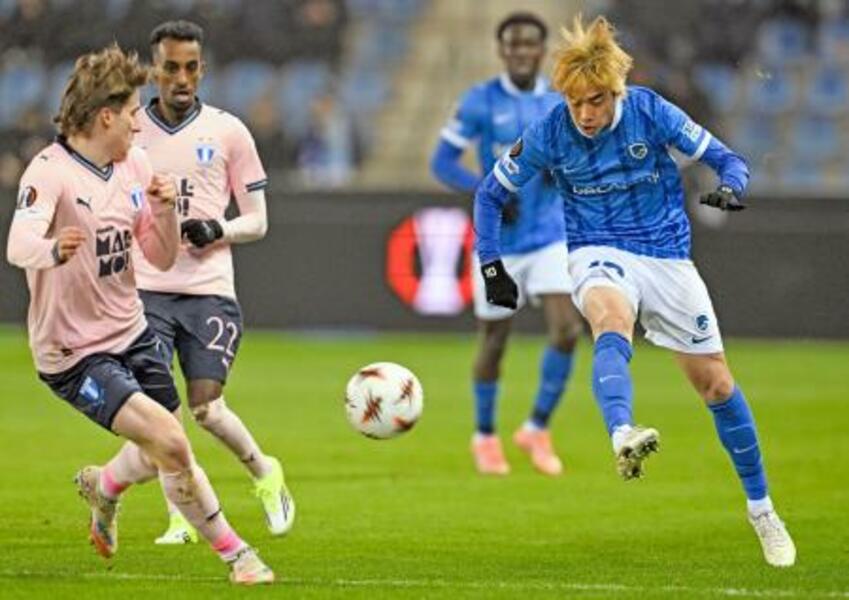 マルメ戦の前半、攻め込むゲンクの伊東(右)=ゲンク(共同)