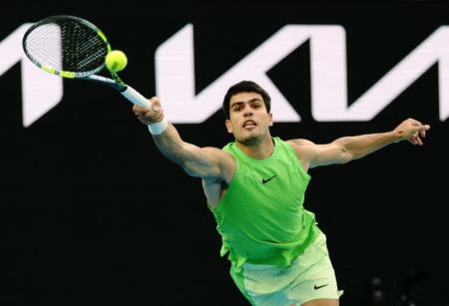 男子シングルス準決勝でプレーするカルロス・アルカラス=メルボルン(ロイター=共同)