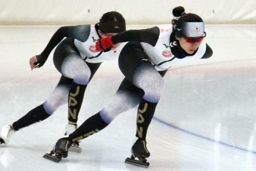 合宿で力強い滑りを見せる高木美帆(右)=ドイツ・インツェル(共同)