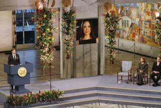 マチャド氏不在の中で開かれたノーベル平和賞授賞式=2025年12月、オスロ(共同)
