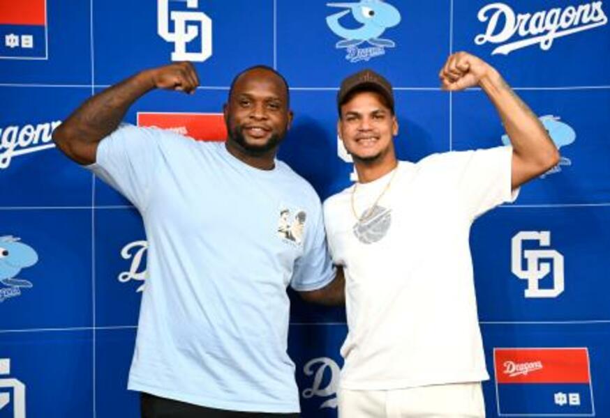 入団記者会見を終え、ポーズをとる中日の新外国人選手のサノー(左)とアブレウ=31日、沖縄県北谷町