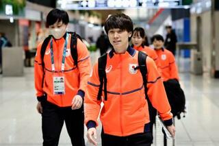イタリア・ミラノのマルペンサ空港に到着したスピードスケートの森重航(手前)ら=1月31日(共同)