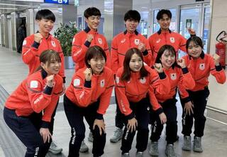ミラノ入りし、撮影に応じるショートトラック日本代表。前列左から長森遥南、平井亜実、中島未莉、渡辺碧、金井莉佳。後列左から岩佐暖、渡辺啓太、宮田将吾、吉永一貴=1月31日、イタリア・ミラノのリナーテ空港(共同)