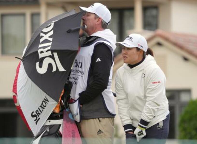第3ラウンド、17番ティーでプレーの再開を待つ畑岡奈紗(右)。16ホールを終え通算5アンダーで暫定6位=レークノナ・クラブ(共同)