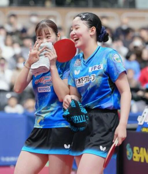 卓球の全日本選手権女子ダブルスで長崎美柚(左)とのペアで優勝し、喜ぶ張本美和。史上初の4冠を達成=1日、豊田市総合体育館