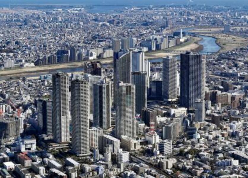 タワーマンションが立ち並ぶ川崎市の武蔵小杉駅周辺=1月(共同通信社ヘリから)