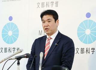 記者会見する松本文科相=3日午前、文科省