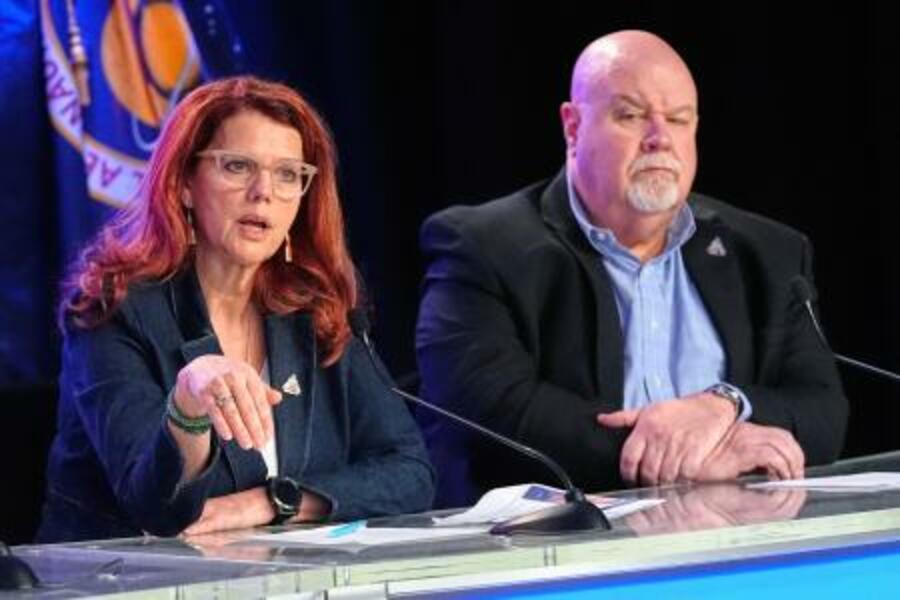 記者会見するNASA担当者=3日、米フロリダ州のケネディ宇宙センター(AP=共同)
