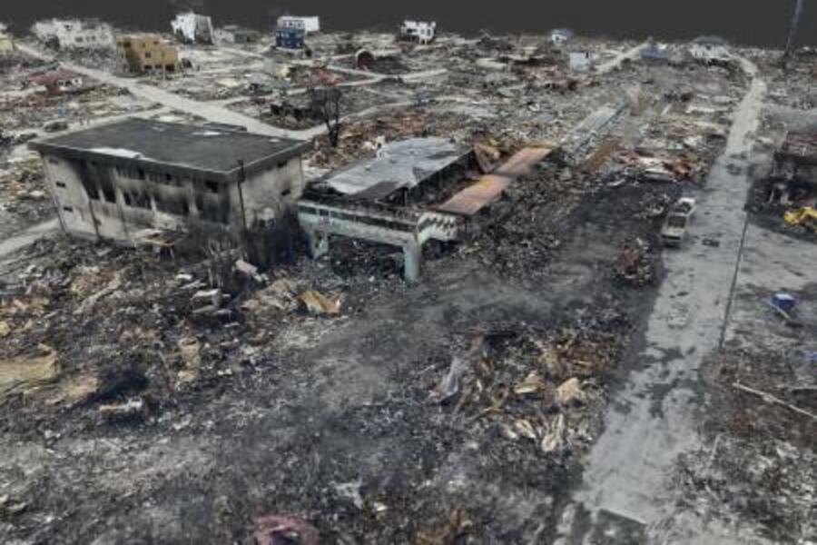 東日本大震災で津波火災の被害を受けた岩手県山田町のJR陸中山田駅(中央)周辺の3D画像から。道路の黒く焦げて見える部分が火の通り道になっていたとみられる。2011年3月23日に撮影した航空写真を基に、共同通信が一橋大の谷田川達也准教授と協力して作成した