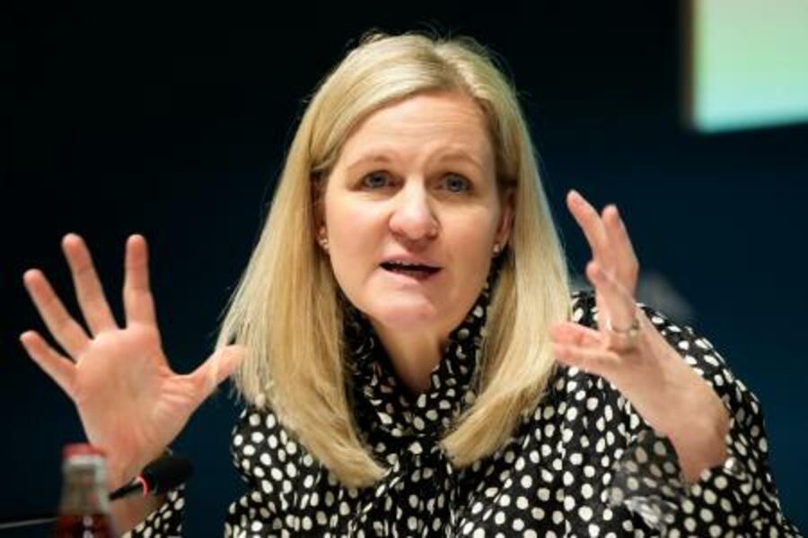 記者会見するIOCのコベントリー会長=4日、イタリア・ミラノ(共同)
